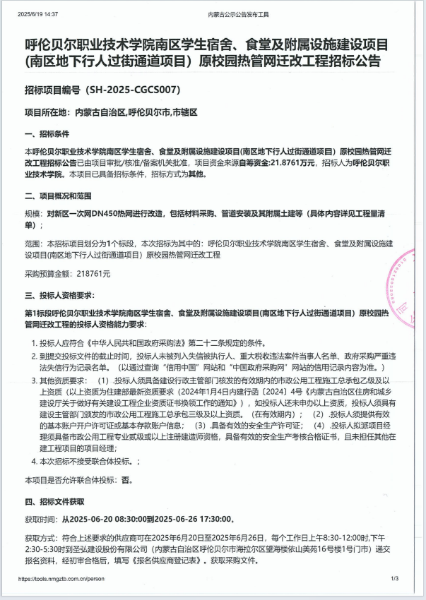 呼伦贝尔职业技术学院南区学生宿舍、食堂及附属设施建设项目(南区地下行人过街通道项目)原校园热管网迁改工程招标公告