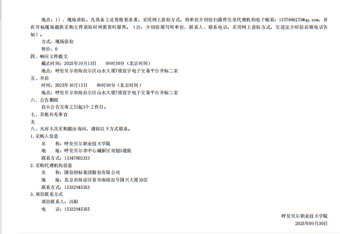 呼伦贝尔职业技术学院设备采购项目比价公告